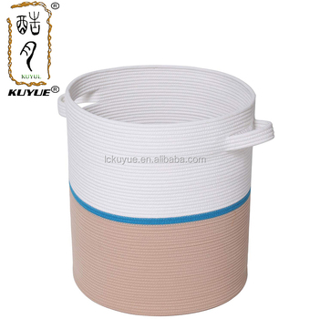 KUYUEブラウン+ブルー,ステッチマルチカラーコットンロープバスケット,収納バスケット,ランドリーバスケット